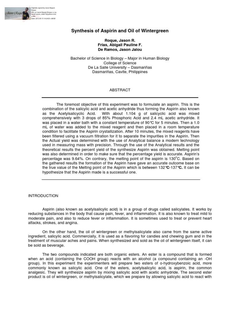 Synthesis of aspirin lab report abstract. In this experiment aspirin also known as acetylsalicylic acid was synthesized from salicylic acid and acetic anhydride. Aspirin is a medicine commonly found in households around the world. Open 7 Days a Week.